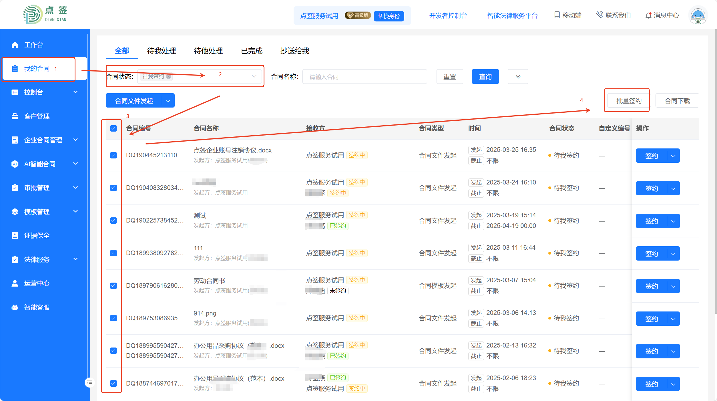 登录系统后,进入我的合同列表,合同状态选择“待我签约”,勾选需要批量签约的文件,点击批量签约。