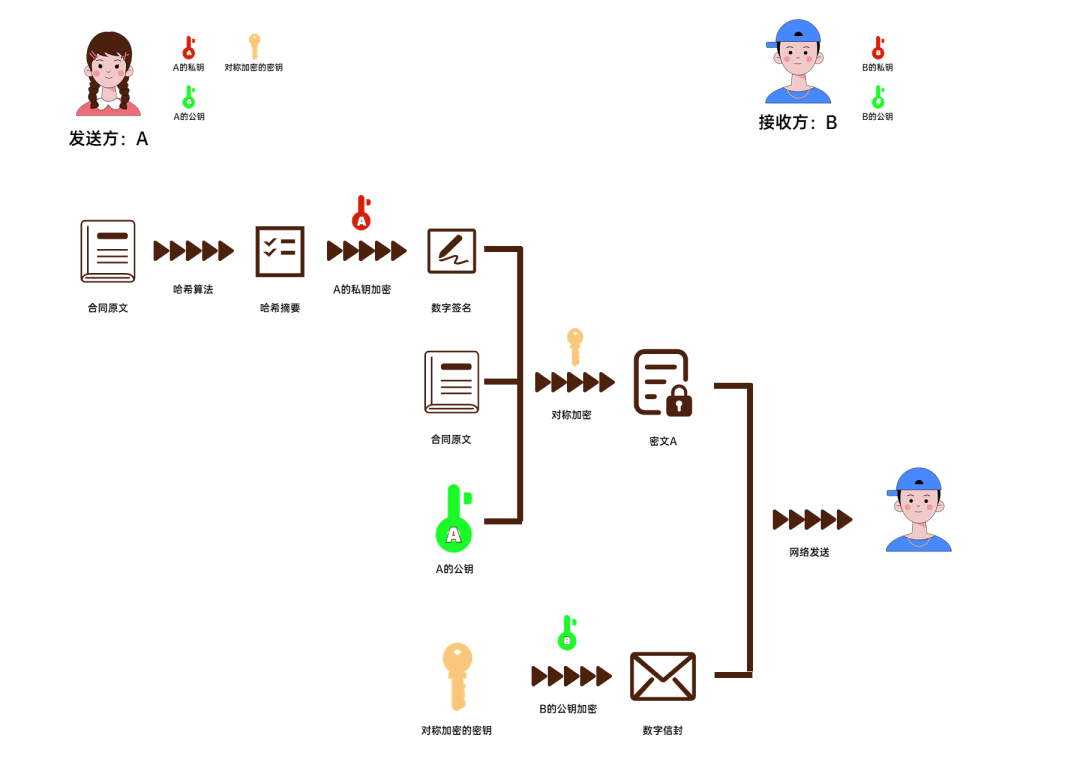 1、A通过哈希运算得到原文摘要并使用私钥对其加密,得到A的数字签名,再将数字签名、合同原文以及A的公钥一同进行对称加密,得到密文A——对原文加密;