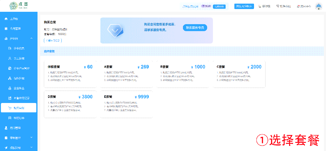企业管理员进入购买套餐页面,可根据需要选择套餐进行购买。