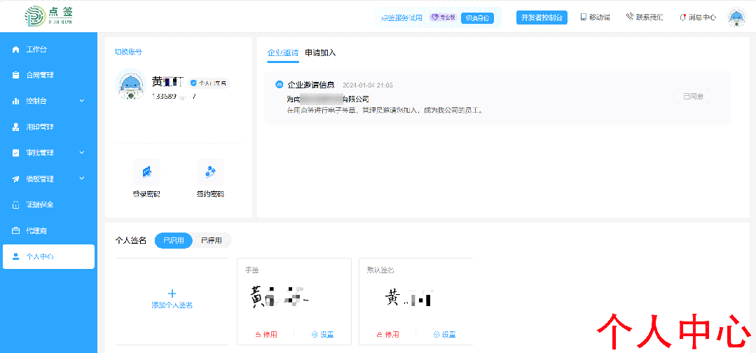 显示个人的信息,可修改登录密码、签约密码、新增个人签名、修改签名、停用/启用签名。