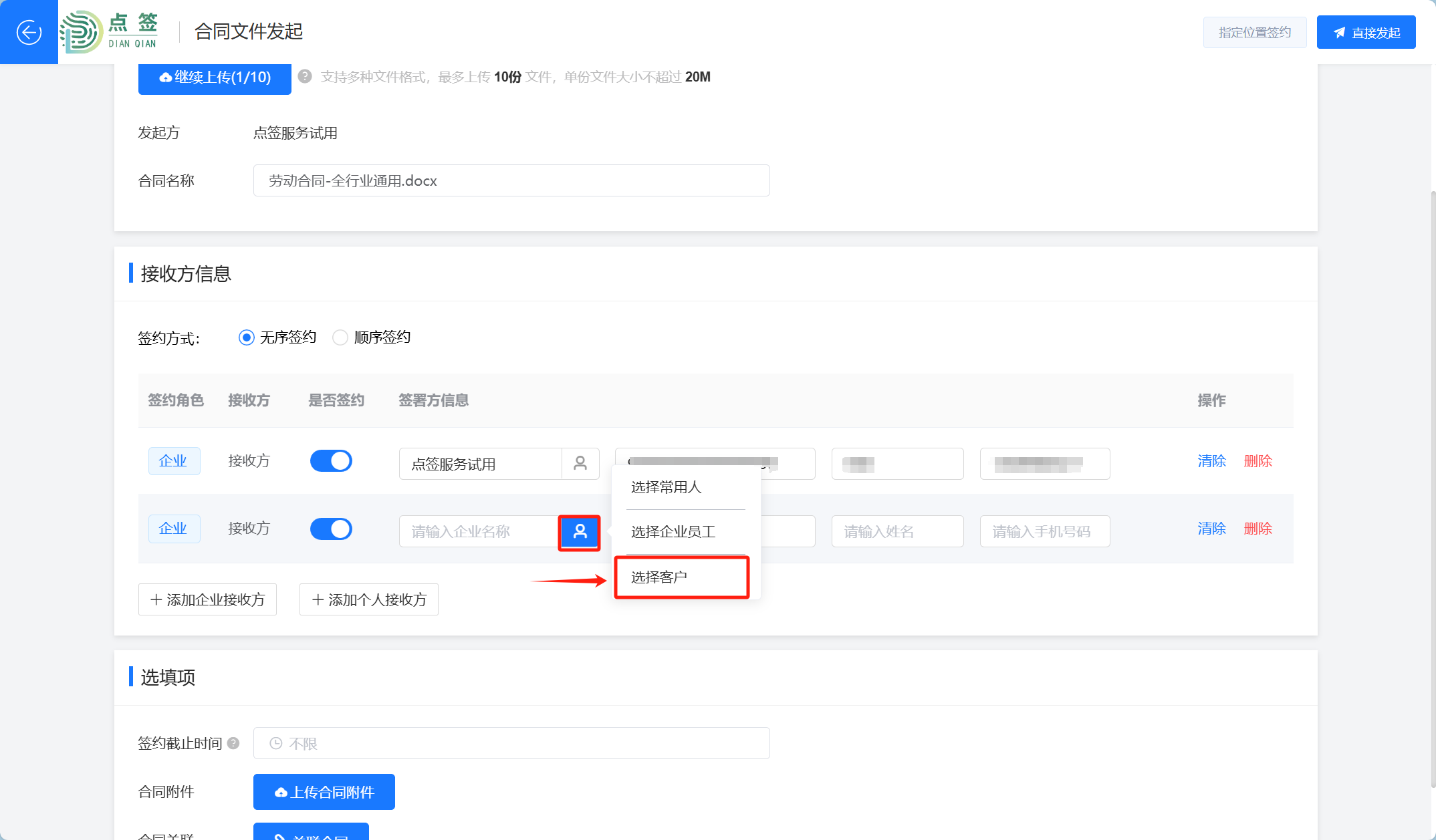 进入合同发起页面,添加企业联系人,可快速选择客户进行合同发起